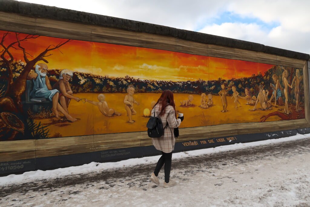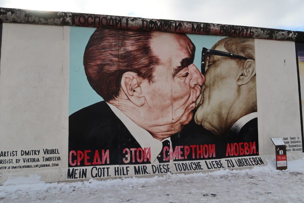 Para a nossa segunda paragem, temos de mencionar o Memorial do Muro de Berlim. Esta barreira de betão fortemente fortificada, com 155 quilómetros de comprimento, dividiu a cidade de 13 de agosto de 1961 a 9 de novembro de 1989. O muro costumava ser visível em muitas partes da cidade, mas atualmente a secção mais longa que sobreviveu está localizada na East Side Gallery. Em 1990, mais de 100 artistas de mais de 20 países decoraram esta secção com as suas obras, criando uma vibrante galeria ao ar livre. A obra mais famosa é o “Beijo Fraterno”, que se encontra no bairro de Friedrichshain.